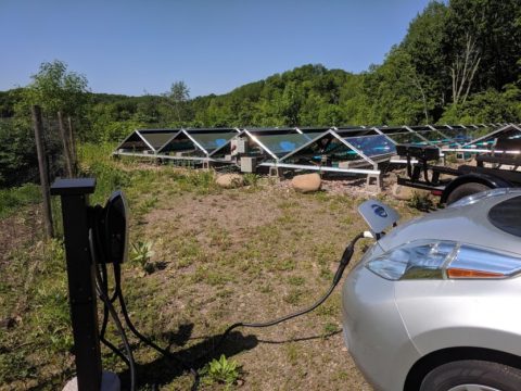 In 2017 we installed a Tesla electric vehicle charger next to the solar panels allowing our electric vehicle owning guests to drive on sunshine. This level 2 charger adds about 30 miles of range per hour of charging. In 2019 we added an adapter to allow all electric vehicles – not just Teslas – to use our charger.